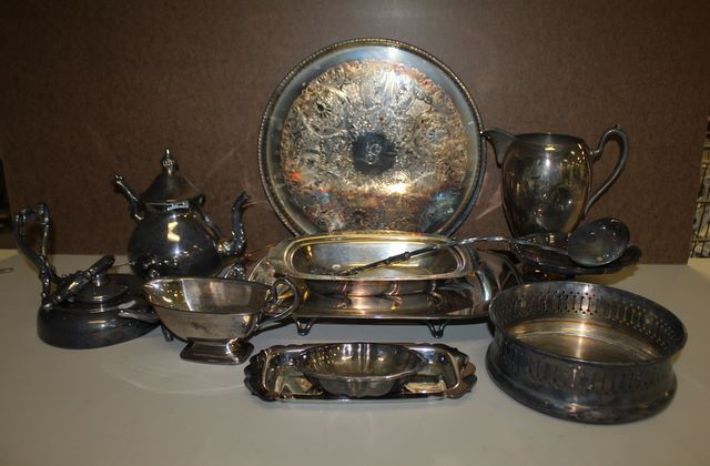 Group of Silverplate Items, includes; Tree of Life footed tray, two trays, base, tea pot with heated stand (broken pieces), gravy, ladle, water pitcher Group of Silverplate Items, includes; Tree of Life footed tray, two trays, base, tea pot with heated stand (broken pieces), gravy, ladle, water pitcher