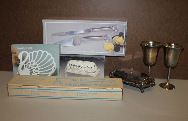 Group of Miscellaneous Items, group consists of; Texas Native Nutcracker (in original box), Swan Trivet, Regal Silverplate butter (new), Serving set (in box), Carter Jeweler's silverplate goblets, silverplate butter Group of Miscellaneous Items, group consists of; Texas Native Nutcracker (in original box), Swan Trivet, Regal Silverplate butter (new), Serving set (in box), Carter Jeweler's silverplate goblets, silverplate butter