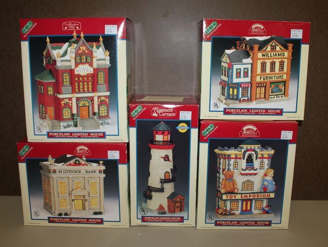 Five Lighted Houses, porcelain lighted houses (Lemax); Hotel, Bank, Furniture store, Lighthouse, toy store Five Lighted Houses, porcelain lighted houses (Lemax); Hotel, Bank, Furniture store, Lighthouse, toy store