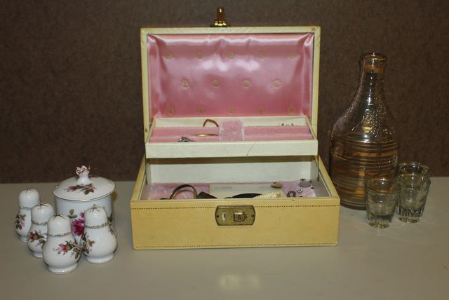 Jewelry Box, Decanter (no stopper) with Three Glasses and a Group of Four Salt and Pepper with Matching Covered Dish Jewelry Box, Decanter (no stopper) with Three Glasses and a Group of Four Salt and Pepper with Matching Covered Dish