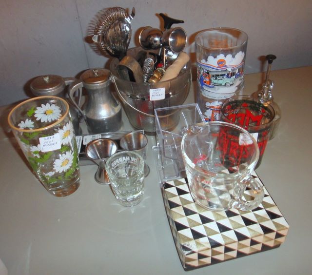 Group of Kitchen Items; metal salt and pepper shakers, four drinking glasses, tooth pick dispenser, three shot glasses and various utensils Group of Kitchen Items; metal salt and pepper shakers, four drinking glasses, tooth pick dispenser, three shot glasses and various utensils