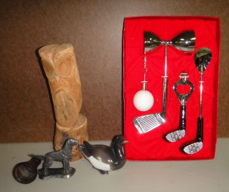 Miscellaneous Items (carved owl, glass duck, wine & beer golf kit, metal dog figurine, eye piece) Miscellaneous Items (carved owl, glass duck, wine & beer golf kit, metal dog figurine, eye piece)