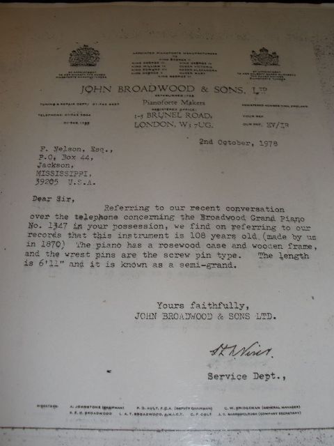 Rosewood John Broadwood & Sons, Inc. Piano #1347, Made in 1870, together with the piano stool. L. 6'11", w. 4'5" Rosewood John Broadwood & Sons, Inc. Piano #1347, Made in 1870, together with the piano stool. L. 6'11", w. 4'5"