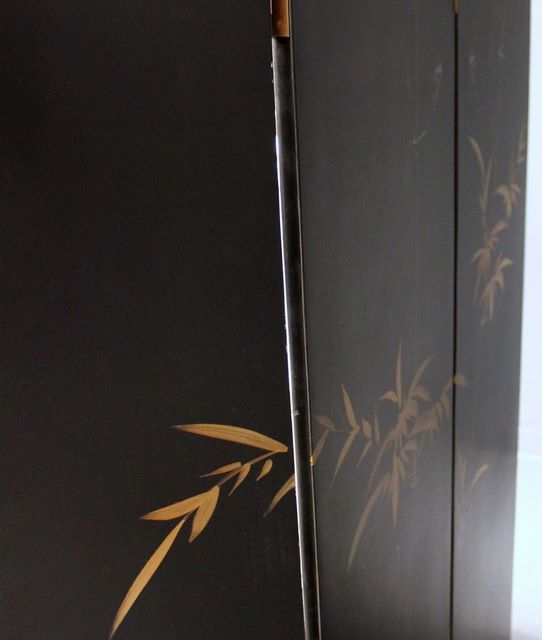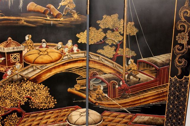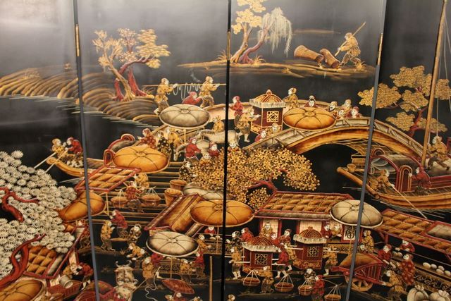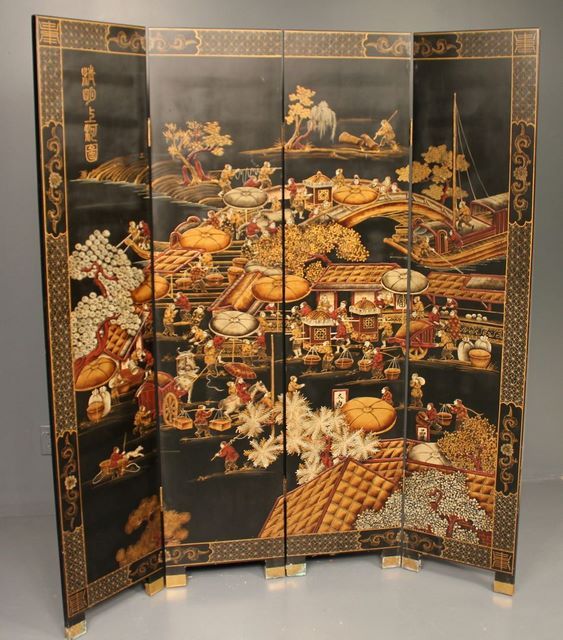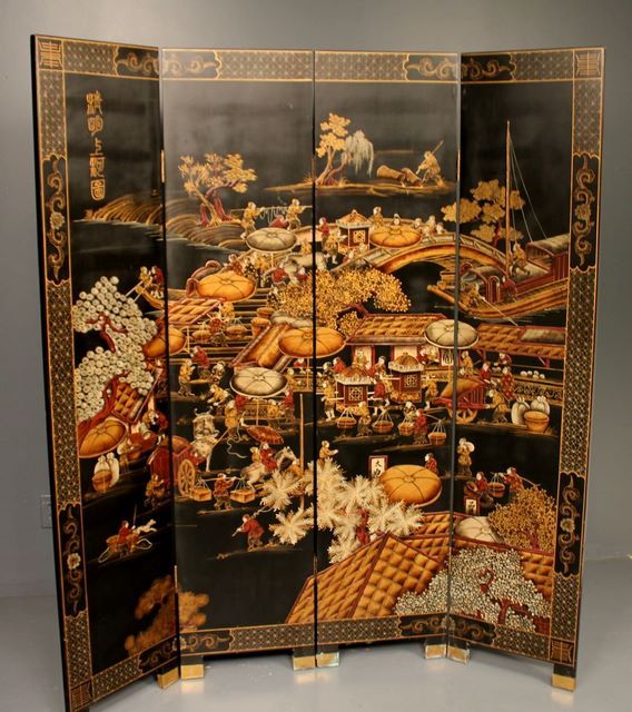 1970's Vintage Beijing Made Four Panel Floor Screen with raised gold and silver paint celebrating Ching/Ming festival, each panel 16" w., 72" h. 1970's Vintage Beijing Made Four Panel Floor Screen with raised gold and silver paint celebrating Ching/Ming festival, each panel 16" w., 72" h.