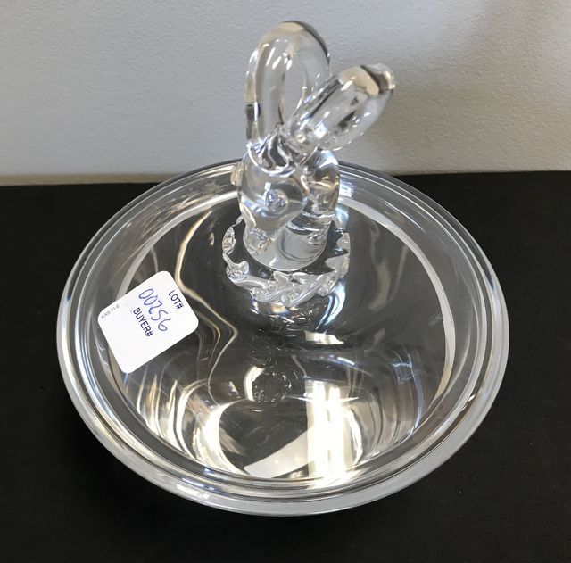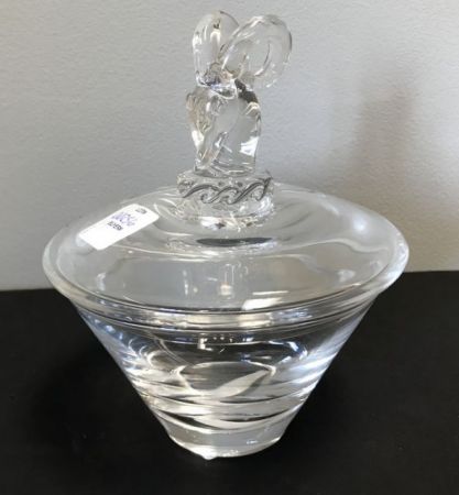 Signed Steuben Covered Candy Dish with Rams Head, 1943 Designed by Irene Benton, signed, 6"h. Signed Steuben Covered Candy Dish with Rams Head, 1943 Designed by Irene Benton, signed, 6"h.