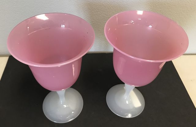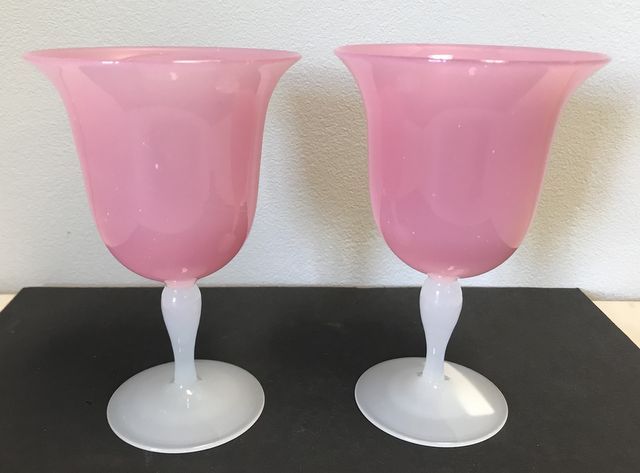 Steuben Set of 2 Rosaline Pink & Alabaster Wine Glasses, one has small rim nic, 6"h. Steuben Set of 2 Rosaline Pink & Alabaster Wine Glasses, one has small rim nic, 6"h.