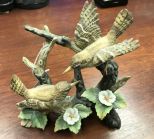 Bisque Birds in Wooden Branches, crown A mark, 7"h. Bisque Birds in Wooden Branches, crown A mark, 7"h.