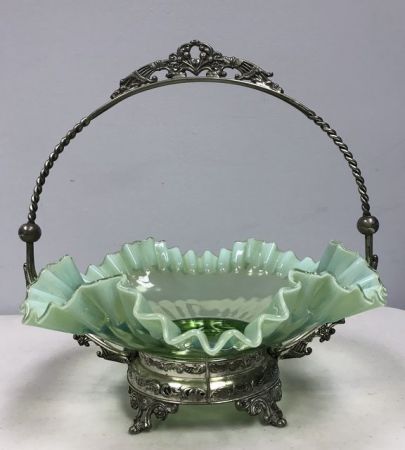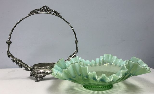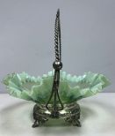 Green glass 19th century bride's basket with silver plated footed holder with handle. H: 11.5" Green glass 19th century bride's basket with silver plated footed holder with handle. H: 11.5"