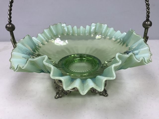 294 19th Century Bride's Basket Green Glass H: 11.5"