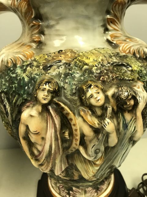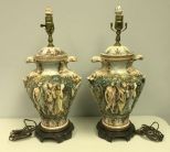Pair of Early Capodimonte Urns turned into Lamps, hand painted, ornate figural designs, H: 23" Pair of Early Capodimonte Urns turned into Lamps, hand painted, ornate figural designs, H: 23"