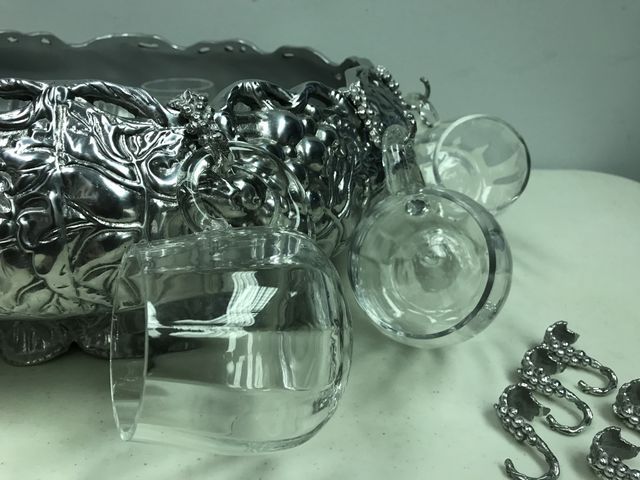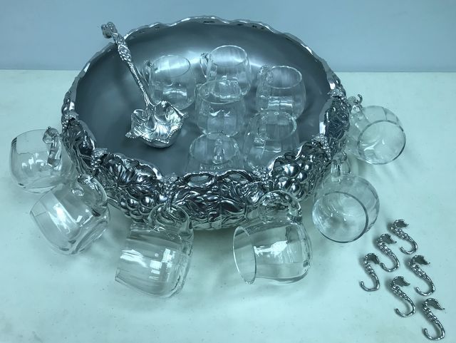 Arthur Court Large Punch Bowl Set, 12 glass cups and hangers, includes ladle, H: 6.5" W:17" Arthur Court Large Punch Bowl Set, 12 glass cups and hangers, includes ladle, H: 6.5" W:17"