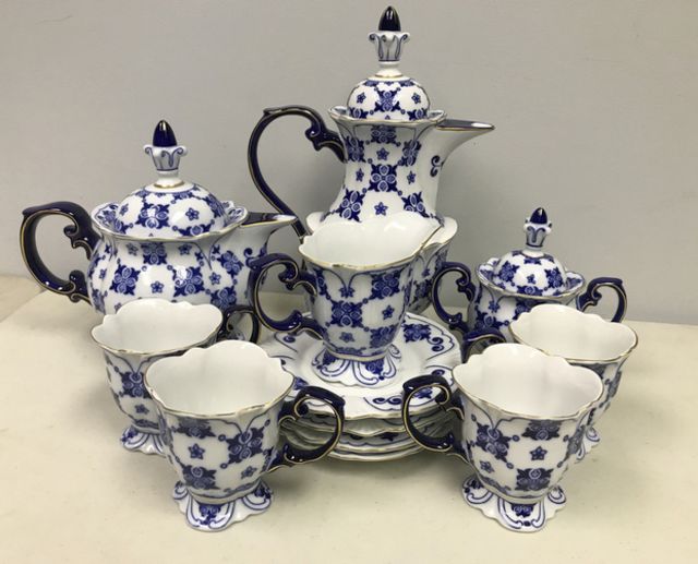 Bombay Tea & Coffee Set for 4 With Cream & Sugar, blue and white porcelain, good condition, pitcher is 14"h. Bombay Tea & Coffee Set for 4 With Cream & Sugar, blue and white porcelain, good condition, pitcher is 14"h.