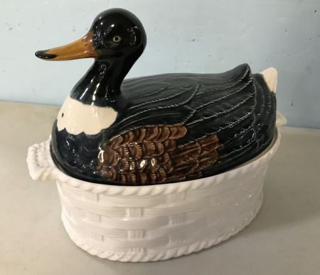 Duck Covered Serving Dish, hand painted, makers mark, 9"h., 11"w. Duck Covered Serving Dish, hand painted, makers mark, 9"h., 11"w.