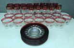 Indiana Red Kings Crown Thumbprint Glasses (7 water 6"h, 9 wine, 13 Sherbet, 6 Plates). Indiana Red Kings Crown Thumbprint Glasses (7 water 6"h, 9 wine, 13 Sherbet, 6 Plates).