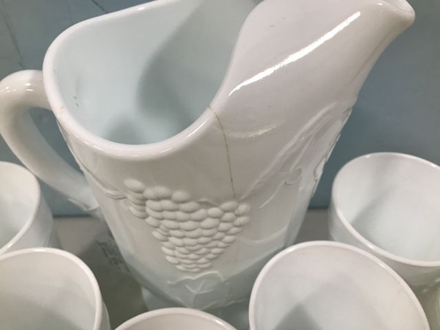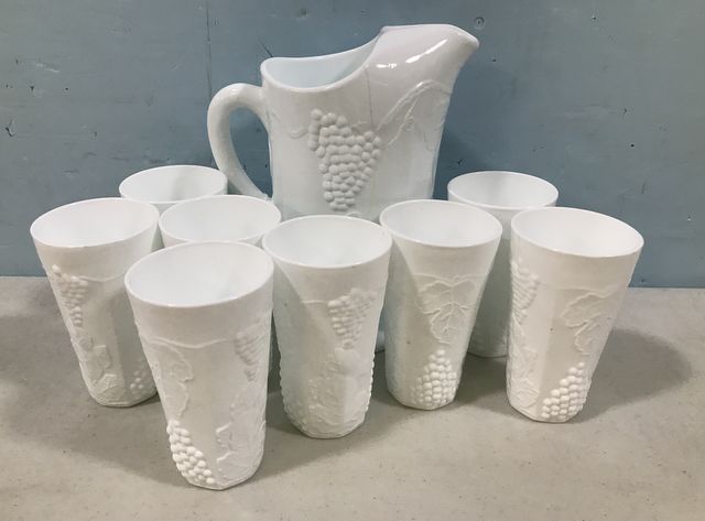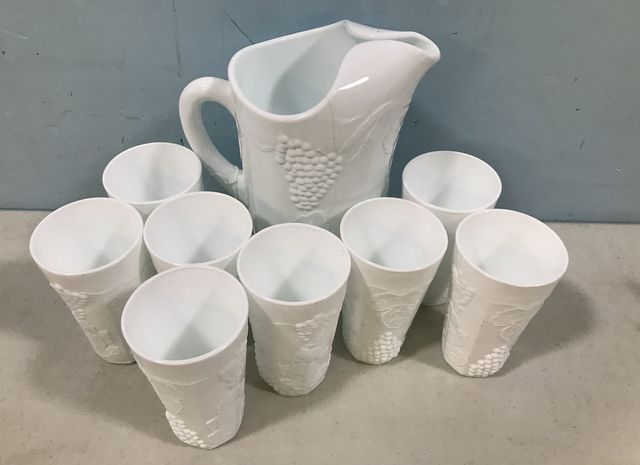 Indiana Glass 9 Piece Milk Glass Pitcher (has hair line crack down side) & Large Tumbler Set Harvest Grape Pattern, pitcher is 10"h., cups are 6"h. Indiana Glass 9 Piece Milk Glass Pitcher (has hair line crack down side) & Large Tumbler Set Harvest Grape Pattern, pitcher is 10"h., cups are 6"h.