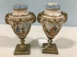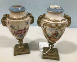 Small Pair of Old Paris Vases w/ Bronze Mounts, head painted, ram heads, couple imagery scene, has age wear, 6 1/2"h. Small Pair of Old Paris Vases w/ Bronze Mounts, head painted, ram heads, couple imagery scene, has age wear, 6 1/2"h.
