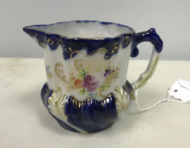 Vintage Flow Blue Creamer, hand painted, gold trim work, white and blue, 3 1/2"h. Vintage Flow Blue Creamer, hand painted, gold trim work, white and blue, 3 1/2"h.