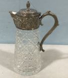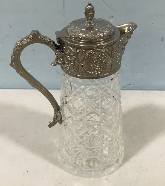 Fine Crystal Cut Water Pitcher with Silver Grape Vine Design, Man's Face as Spout., 11"h. Fine Crystal Cut Water Pitcher with Silver Grape Vine Design, Man's Face as Spout., 11"h.