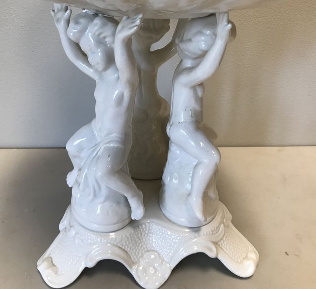 White Porcelain 3 Cherubs Compote, two piece, crimped rim top, H: 13.25" W: 12" White Porcelain 3 Cherubs Compote, two piece, crimped rim top, H: 13.25" W: 12"