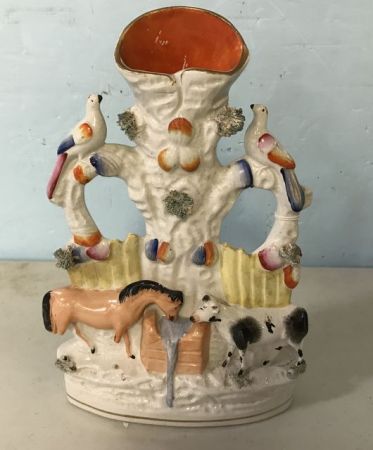 Staffordshire Style Horse & Cow Drinking form Water Trough w/ Birds on Branches Spill Vase/Figurine. horses legs are broken, 10"h. Staffordshire Style Horse & Cow Drinking form Water Trough w/ Birds on Branches Spill Vase/Figurine. horses legs are broken, 10"h.