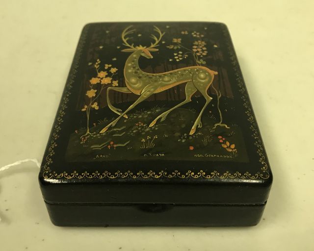 Black Lacquered Box With Deer, hand painted, 4 1/2" x 3". Black Lacquered Box With Deer, hand painted, 4 1/2" x 3".