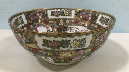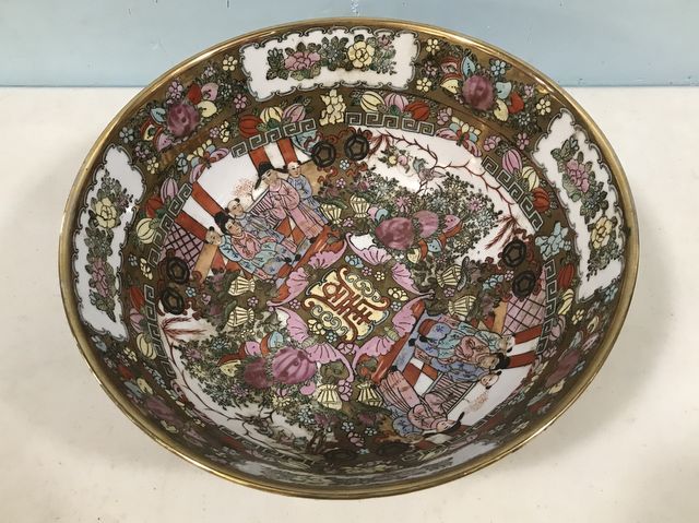 Large Rose Medallion Style Rice Bowl, hand painted porcelain, 6 1/2"h., 13 1/2"dia. Maker mark on bottom. Large Rose Medallion Style Rice Bowl, hand painted porcelain, 6 1/2"h., 13 1/2"dia. Maker mark on bottom.