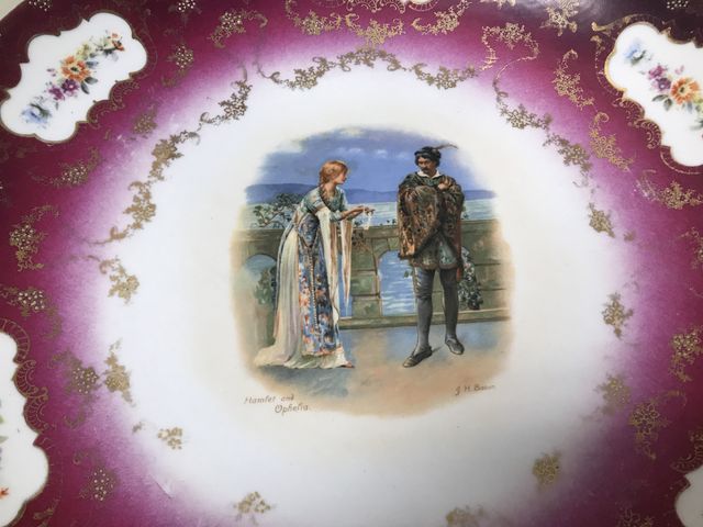 19th C Pair of Hand Painted Austrian Chargers "Carisbad Austre", by J.H. Baton, hand painted, Hamet and Ophelia, Falstaff and Mrs. Ford, 13 1/2"dia. 19th C Pair of Hand Painted Austrian Chargers "Carisbad Austre", by J.H. Baton, hand painted, Hamet and Ophelia, Falstaff and Mrs. Ford, 13 1/2"dia.