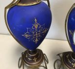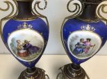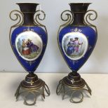 Pair of Royal Blue Old Paris Vases with Courting Scenes, hand painted portrait scenes, one has damage rim, H:14.5" Pair of Royal Blue Old Paris Vases with Courting Scenes, hand painted portrait scenes, one has damage rim, H:14.5"