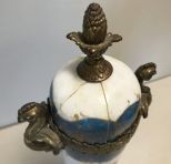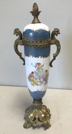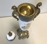 Hand Painted Blue Sevres Urn w/ Artist Signed, painted Woman imagery, brass handles and base, (lid damage)H: 16.25" Hand Painted Blue Sevres Urn w/ Artist Signed, painted Woman imagery, brass handles and base, (lid damage)H: 16.25"
