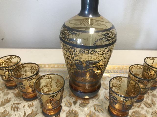 8 Piece Cordial Silver Plate Inlaid Set, decanter, and 6 glasses, H: 11.5" *has tray 8 Piece Cordial Silver Plate Inlaid Set, decanter, and 6 glasses, H: 11.5" *has tray