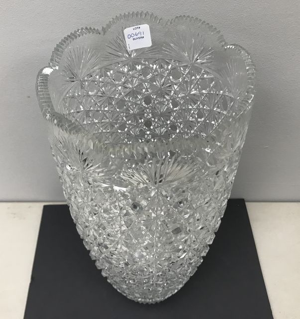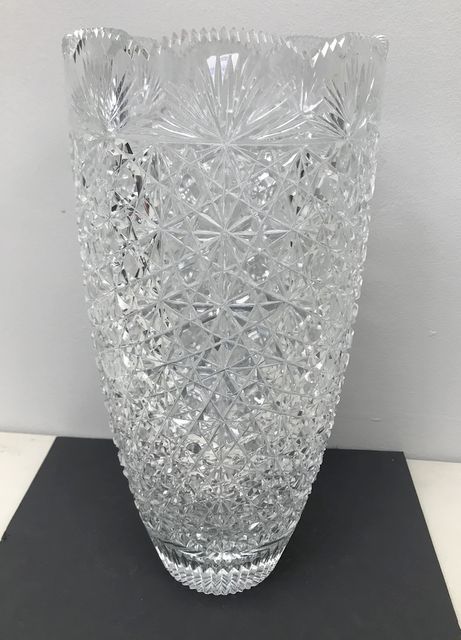 Large Cut Crystal Vase, heavy, cut rim design, good condition, beautiful cut glass vase, 15"h., 7"dia. Large Cut Crystal Vase, heavy, cut rim design, good condition, beautiful cut glass vase, 15"h., 7"dia.