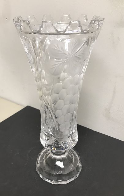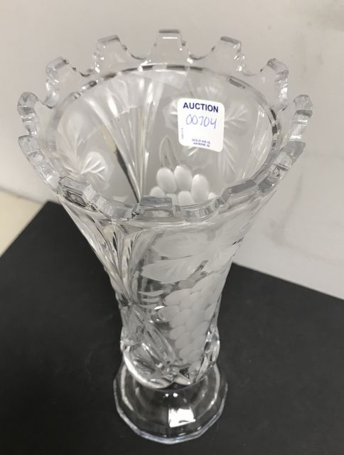 Cut Crystal Vase w/ Etched Grapes, unique rim pattern, 10 1/2"h., 4 1/2"dia. Cut Crystal Vase w/ Etched Grapes, unique rim pattern, 10 1/2"h., 4 1/2"dia.