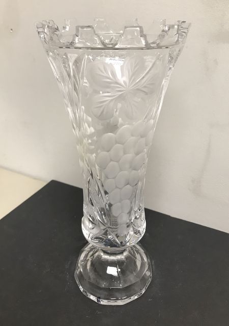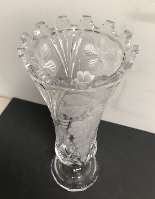 Cut Crystal Vase w/ Etched Grapes, unique rim pattern, 10"h., 4 1/2"dia. Cut Crystal Vase w/ Etched Grapes, unique rim pattern, 10"h., 4 1/2"dia.
