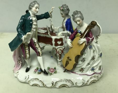 Dresden Figurine of 2 ladies & gentleman playing music & singing, porcelain, hand painted. H: 7 1/2" Dresden Figurine of 2 ladies & gentleman playing music & singing, porcelain, hand painted. H: 7 1/2"
