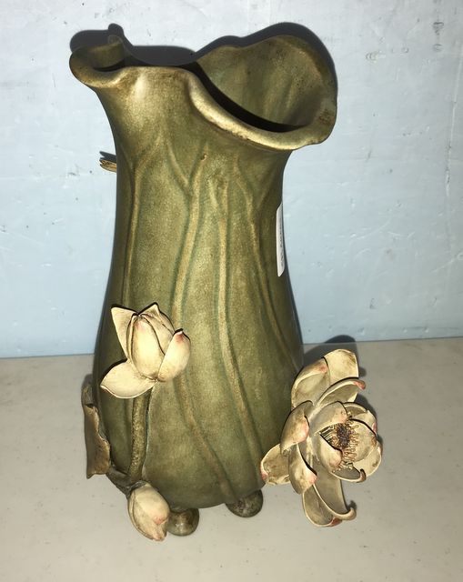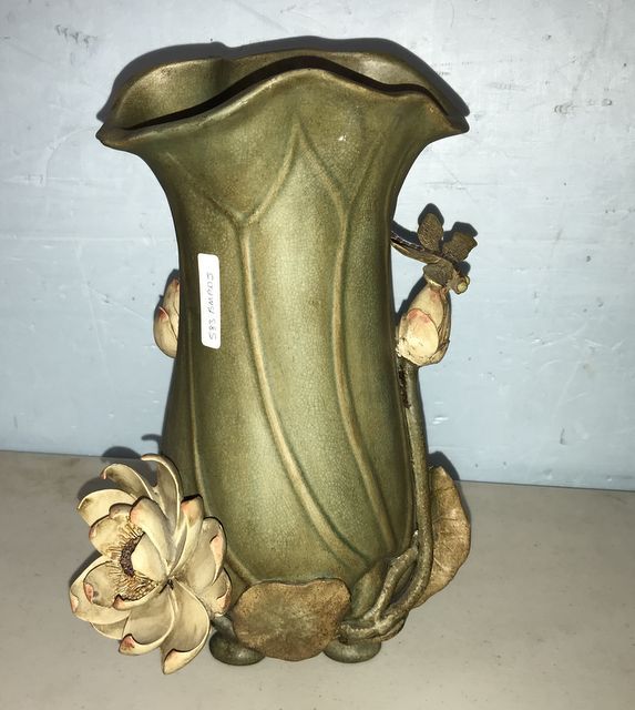 Green Art Nouveau Vase With Dragonfly and flowers, one flower has repair, and little chip, 13"h. Green Art Nouveau Vase With Dragonfly and flowers, one flower has repair, and little chip, 13"h.