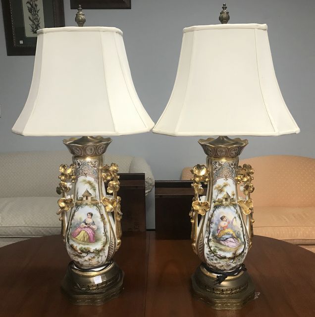Pair of Old Paris Lamps, porcelain, gold gilt, ornate brass bases, shades, portrait of Woman, 36"h. Pair of Old Paris Lamps, porcelain, gold gilt, ornate brass bases, shades, portrait of Woman, 36"h.