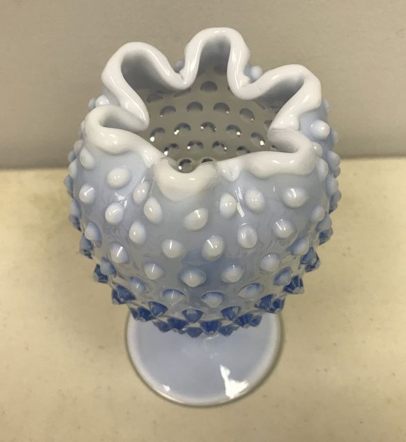 Vintage Blue Cramped Top Opalescent Hobnail Vase, footed, 8"h. Vintage Blue Cramped Top Opalescent Hobnail Vase, footed, 8"h.