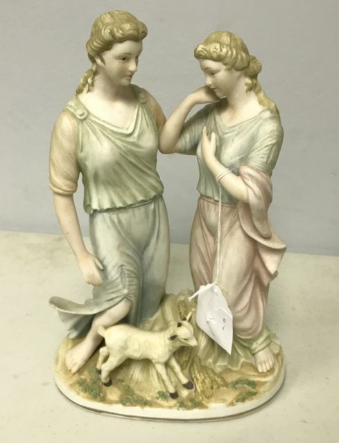 Fine Porcelain Statue of Two Women Standing with a Baby Lamb in the Center of them, hand painted, has bottom mark, 12"h. Fine Porcelain Statue of Two Women Standing with a Baby Lamb in the Center of them, hand painted, has bottom mark, 12"h.
