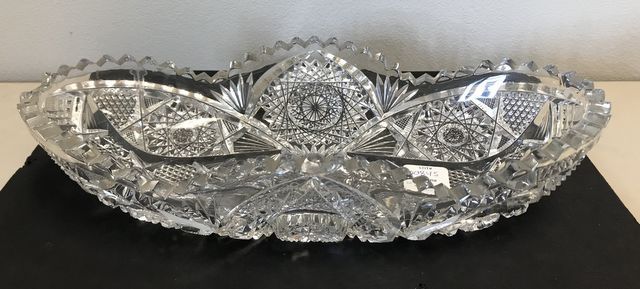 Large Cut Crystal Boat Style Serving Dish, vintage piece, does have rim chips, 2 1/2"h., 12"w. Large Cut Crystal Boat Style Serving Dish, vintage piece, does have rim chips, 2 1/2"h., 12"w.