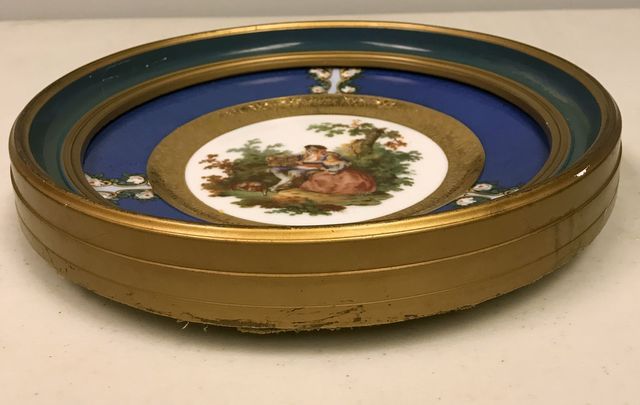 Sevres Plate w/ Courting Scene w/ 22 K Gold Outline and in Frame , H: 2.25" L: 10" Sevres Plate w/ Courting Scene w/ 22 K Gold Outline and in Frame , H: 2.25" L: 10"