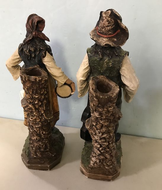 Pair of Figurines of Gypsy's with Musical Instruments, not old, woman has a chip on scarf, 19"h. Pair of Figurines of Gypsy's with Musical Instruments, not old, woman has a chip on scarf, 19"h.
