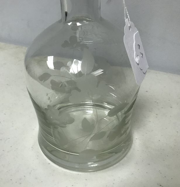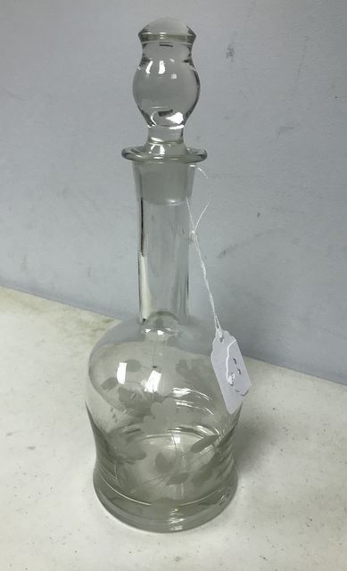 Vintage Glass Decanter, etched flowers. with stopper, 13"h. Vintage Glass Decanter, etched flowers. with stopper, 13"h.