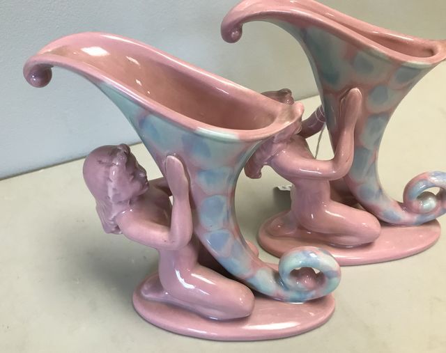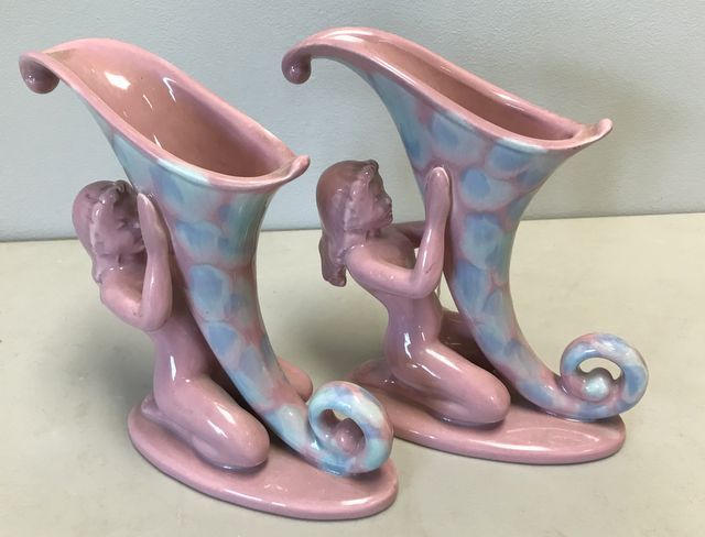 Vintage Royal Haeger Mid Century Art Pottery Cornucopia Vases w/ Nudes, H: 8" Vintage Royal Haeger Mid Century Art Pottery Cornucopia Vases w/ Nudes, H: 8"