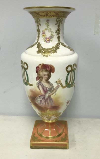 Victorian Style Mantle Vase Hand Painted & Signed by Artist, lady portrait and gold gilt, 18"h. Victorian Style Mantle Vase Hand Painted & Signed by Artist, lady portrait and gold gilt, 18"h.