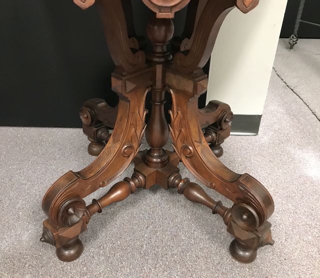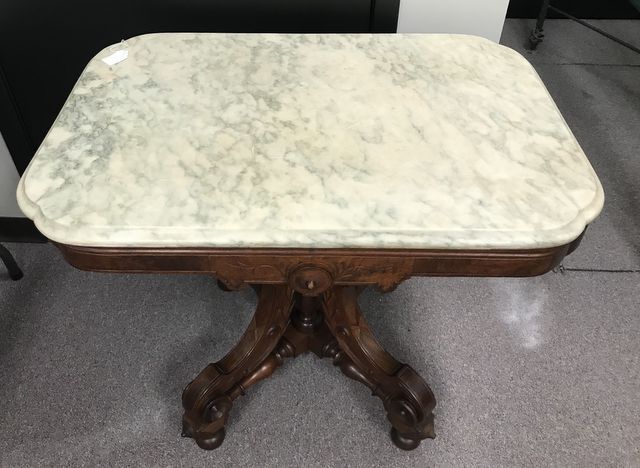 Antique Walnut Victorian Marble Top Center Table, carved pedestal base, white marble (some scratches on marble) 29"h., 37"w., 25"d., good condition, Antique Walnut Victorian Marble Top Center Table, carved pedestal base, white marble (some scratches on marble) 29"h., 37"w., 25"d., good condition,