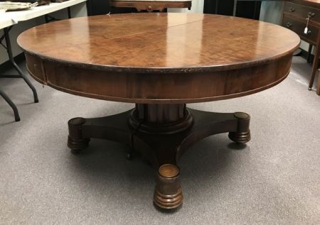 19th Century Mahogany Dining Room Table Signed by Maker "John Burt" on bottom of table, 4 leaves that do not match, table in good condition, pedestal base, 29"h., 54"dia. 19th Century Mahogany Dining Room Table Signed by Maker "John Burt" on bottom of table, 4 leaves that do not match, table in good condition, pedestal base, 29"h., 54"dia.