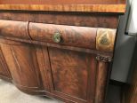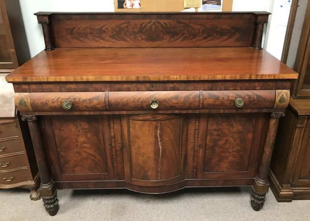 19th Century Empire Mahogany Sideboard, three drawers, three doors, back splash, veneer, column legs, has repair spots, brass knobs are bent, 54"h., 65"w., 25"d. 19th Century Empire Mahogany Sideboard, three drawers, three doors, back splash, veneer, column legs, has repair spots, brass knobs are bent, 54"h., 65"w., 25"d.