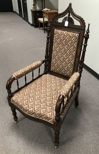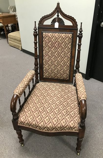 Antique Mahogany Gothic Armchair, dark finish, missing top finial, upholstered seats, 48"h. Antique Mahogany Gothic Armchair, dark finish, missing top finial, upholstered seats, 48"h.