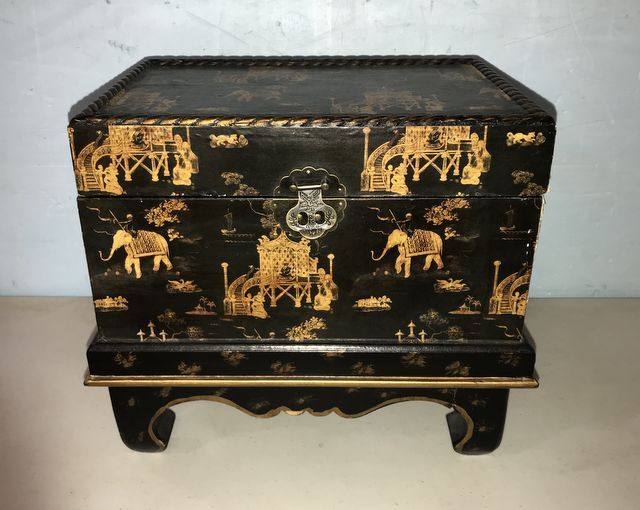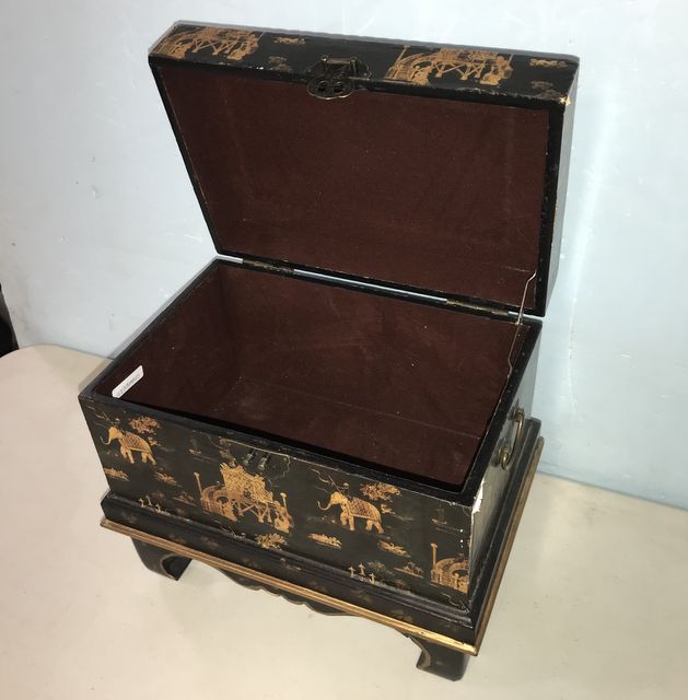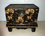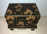 Black Lacquered Oriental Box, hand painted, lift top, small damage on corner, 13"h., 14"w., 9"d. Black Lacquered Oriental Box, hand painted, lift top, small damage on corner, 13"h., 14"w., 9"d.