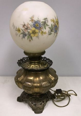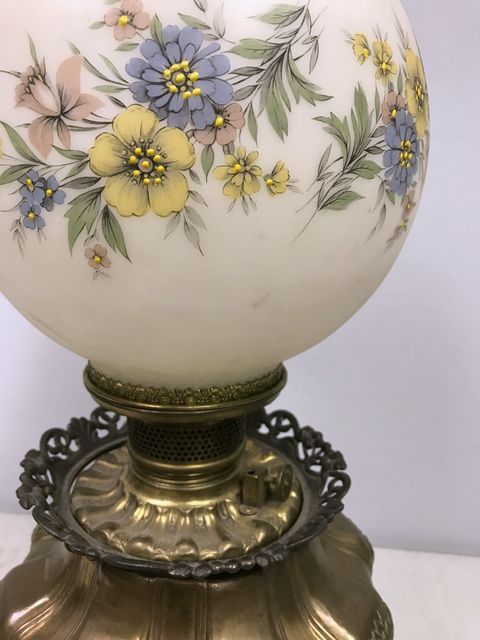 19th Century Brass Oil Lamp w/ Original Shade floral painting, ornate brass base, H: 20"H, W: 9" 19th Century Brass Oil Lamp w/ Original Shade floral painting, ornate brass base, H: 20"H, W: 9"